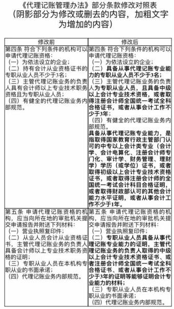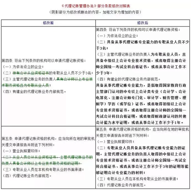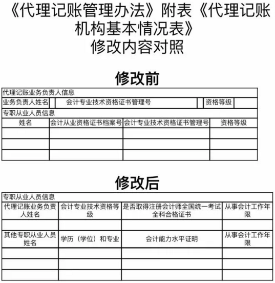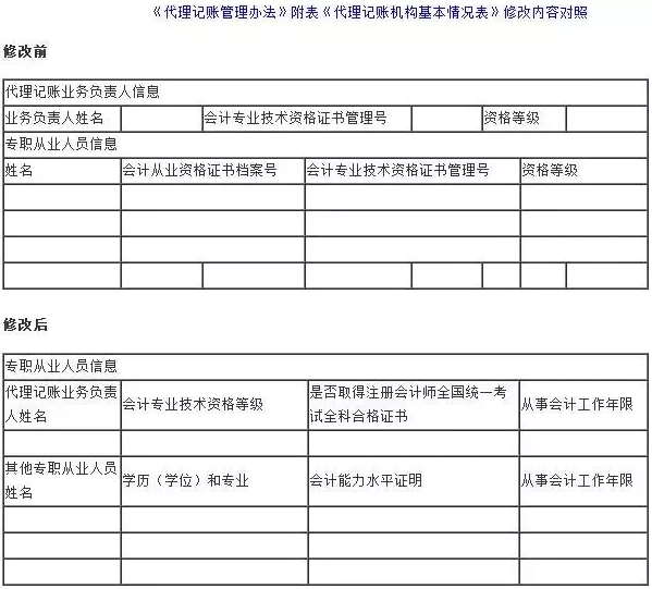 代理記賬的修改部分主要是配合會(huì)計(jì)法的修改條款,把從業(yè)資格的字眼改了,最主要的是改變了報(bào)備的代理機(jī)構(gòu)基本情況表(詳見下文對(duì)比)。