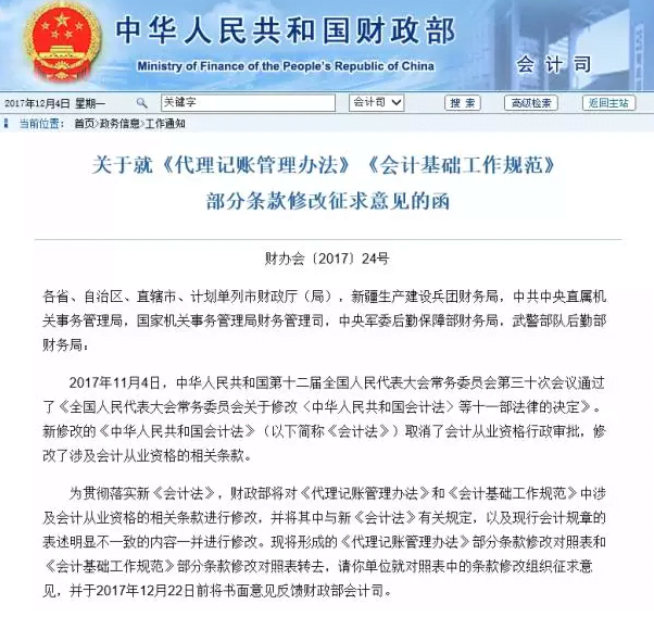 財(cái)政部關(guān)于就《代理記賬管理辦法》《會(huì)計(jì)基礎(chǔ)工作規(guī)范》部分條款修改征求意見的函