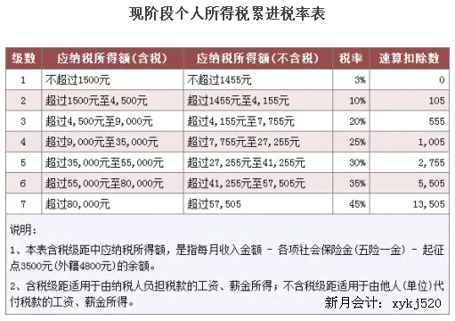 4、稅率:由3%到45%,有7個等級,分別與7個不同區間的應納稅額對應;